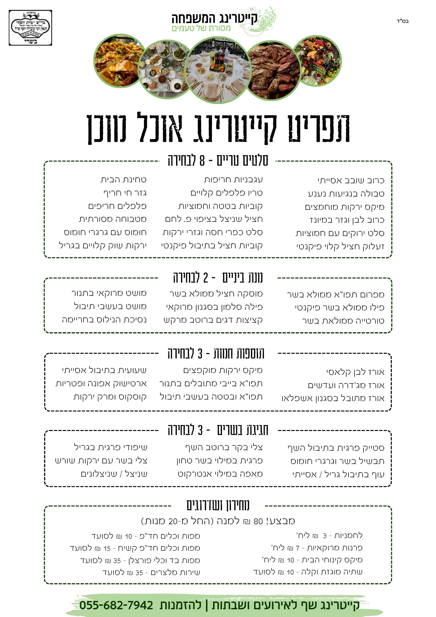 שילוב מושלם של טעמים מסורתיים ומודרניים – לאירוע מכובד, שופע ומרשים.(מבוסס על תפריט “אוכל מוכן” – ראו פירוט מלא בתפריט המצורף )